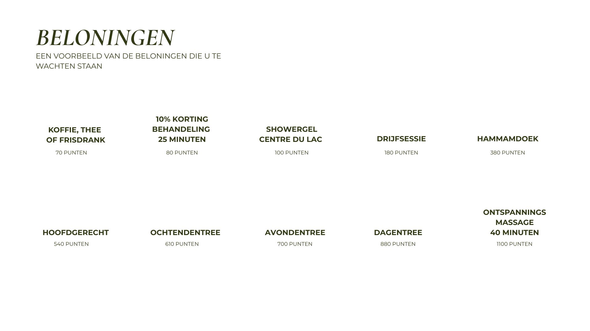 Punten stijgen of dalen naarmate u ze verdient of uitgeeft. Beloningen zijn producten of diensten die u kunt verzilveren op basis van het aantal punten dat u op dat moment heeft (bijvoorbeeld: met 880 punten kunt u een dagentree innen). Niveaus zijn gebaseerd op het totaal aantal punten dat u sinds uw deelname aan DU LAC’S WELLNESSCLUB heeft verdiend, en niet op uw huidige puntenstand.